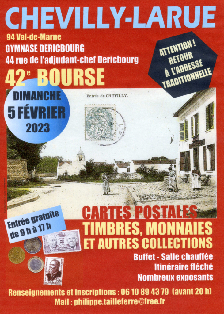 Une bourse destinée aux collectionneurs de cartes postales, de timbres et de monnaies aura lieu le Dimanche 5 Février à Chevilly Larue. Tous les détails sont sur le flyer ci-dessous.